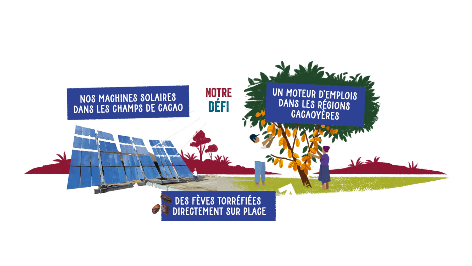 Comment ? Grâce à notre innovation : des torréfacteurs solaires que nous implantons directement dans les plantations de cacao pour une production plus durable et responsable.